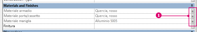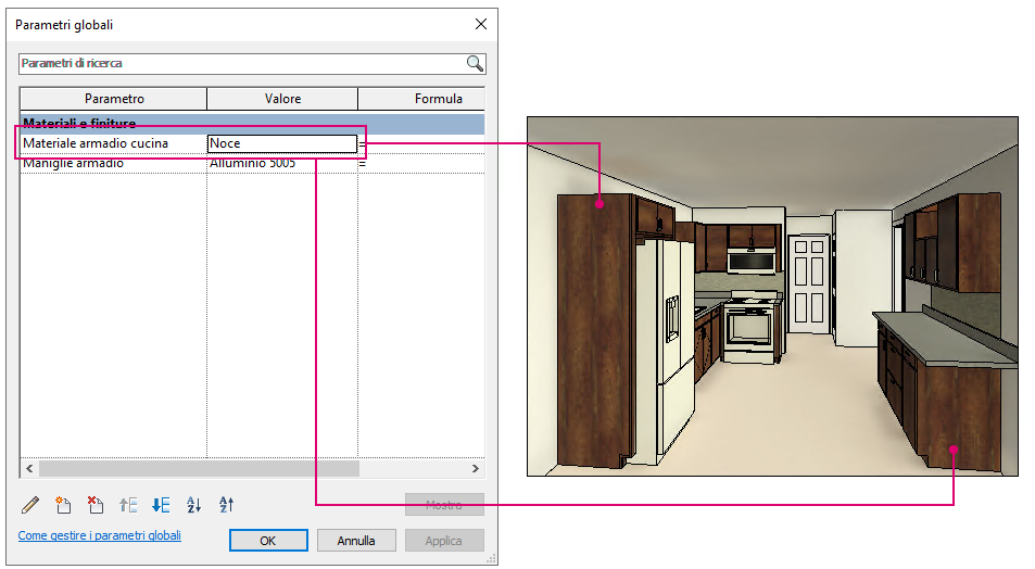 Una volta creato il parametro globale del materiale, assegnarlo al valore del parametro del materiale nelle famiglie di armadi utilizzate nel layout della cucina.