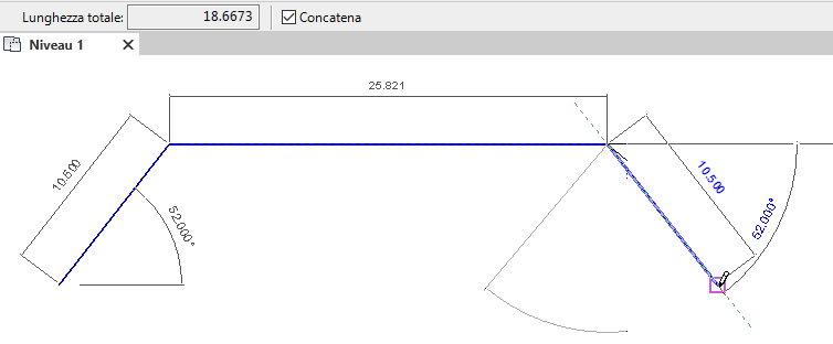 Lo strumento Misura rappresenta un metodo rapido per misurare e visualizzare temporaneamente la lunghezza (ed eventualmente l'angolo a partire dall'orizzontale) di singoli muri, linee di modello o la distanza tra due punti selezionati nelle viste. Nelle viste di prospetto, è possibile utilizzare questo strumento solo per selezionare le estremità dei muri perpendicolari all'orientamento della vista (per visualizzare l'altezza del muro). È possibile disegnare una linea temporanea o una catena di linee che collegano i punti specificati. Le quote generate con lo strumento rimangono visualizzate sullo schermo fino a che non si avvia la successiva misurazione o non si esce dallo strumento. Le quote di lunghezza sono visualizzate anche nella casella Lunghezza totale della barra delle opzioni.