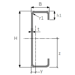 r1. Raccordo interno: raggio del raccordo su angolo interno di una curvatura in una forma di sezione in acciaio lavorato a freddo.