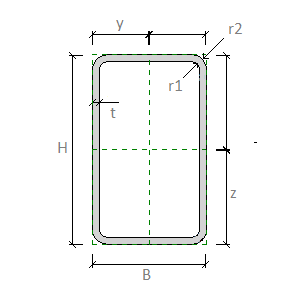 r1. Raccordo interno: raggio del raccordo su angolo interno di una forma di sezione strutturale cava rettangolare.