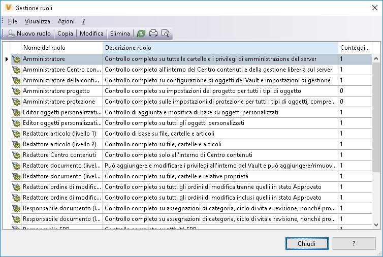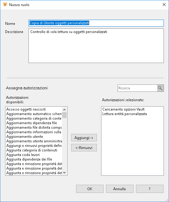 La finestra di dialogo Autorizzazioni ruolo è ora la finestra di dialogo Gestione ruoli. Qui è possibile creare, modificare, copiare ed eliminare i ruoli personalizzati. Questa finestra di dialogo contiene ora le descrizioni dei ruoli per agevolarne la gestione.