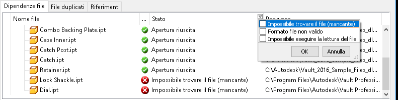 Durante la visualizzazione dell'Anagrafica articoli, è ora possibile vedere se i collegamenti ai file primari, secondari o di documentazione del progetto richiedono un aggiornamento. Ciò garantisce che la distinta componenti CAD e la distinta componenti Vault siano sincronizzate.