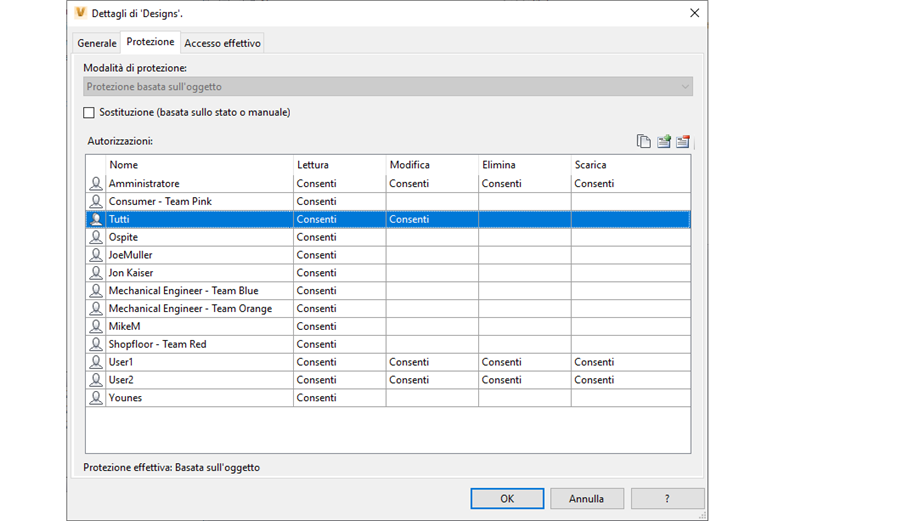 La protezione basata sull'oggetto e quella basata sullo stato del ciclo di vita e i ruoli personalizzati includono ora un'autorizzazione di download. In precedenza, qualsiasi utente o gruppo con l'autorizzazione di lettura poteva scaricare il file. È ora possibile concedere ad alcuni utenti l'autorizzazione per visualizzare il contenuto delle cartelle, accedere alle proprietà dei file, alle schede Usi/Riferimenti e impedire loro di scaricare i file effettivi. Gli utenti che dispongono di un'autorizzazione di lettura solo su un file non possono utilizzare operazioni che richiedono autorizzazioni di download di file quali Copia file di progetto, GET, Pack and Go e così via.