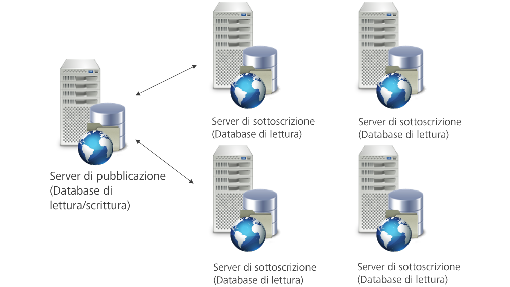 Tutte le operazioni di lettura sono ancora presenti sul server di sottoscrizione, ma le operazioni di scrittura avvengono solo sul server di pubblicazione. La modifica elimina la necessità della proprietà e autorizza le operazioni di scrittura solo sul server di pubblicazione. Tutti i dati presenti nel server di pubblicazione vengono replicati nei server di sottoscrizione per mantenerli aggiornati.