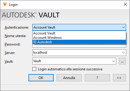 La finestra di dialogo di login è aggiornata per supportare l'ID Autodesk come opzione di autenticazione. L'integrazione dell'ID Autodesk con Vault consente agli amministratori di controllare l'autenticazione utente e l'accesso all'ambiente del Vault.