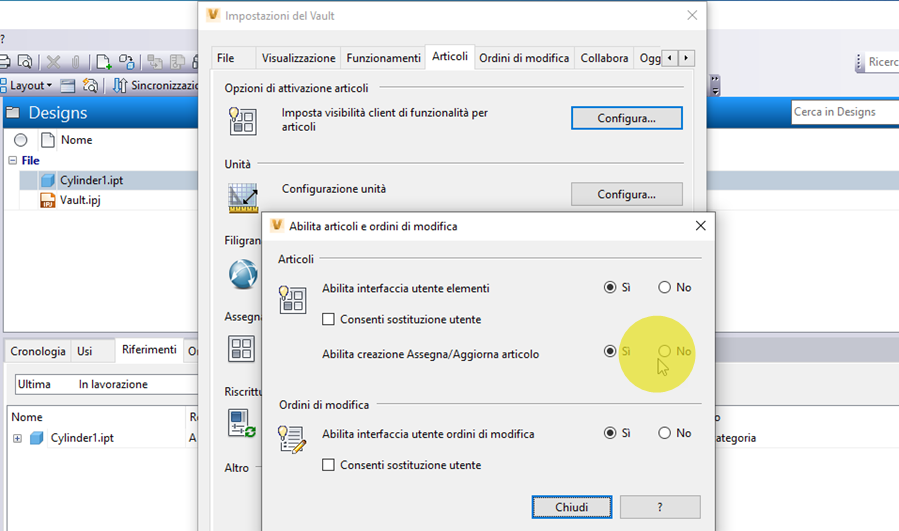 Quando il comando è disabilitato, nessun utente è in grado di assegnare o aggiornare gli articoli in Vault Client e Inventor utilizzando l'opzione del menu contestuale nelle schede "Usi" e "Riferimenti" della finestra di dialogo "Mostra dettagli".