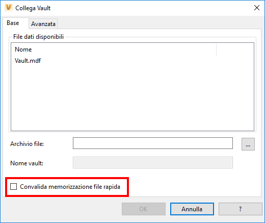 È stata aggiunta una nuova opzione che consente la convalida rapida dei file quando si collega un Vault in ADMS Console. Quando viene collegato un Vault o viene ripristinato un backup, il processo esegue la convalida di un archivio di file per verificare il checksum nel Vault con i file nell'archivio di file. Per le installazioni di grandi dimensioni a livello aziendale, la fase di convalida può richiedere molto tempo. Questa nuova opzione consente solo di verificare l'esistenza del file senza controllare il checksum, che consente una convalida più rapida e un completamento più rapido del processo.