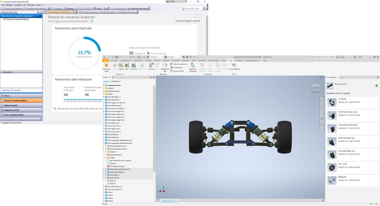 Sono disponibili una serie di nuove funzionalità che consentono all'utente di evitare l'utilizzo di parti duplicate nei progetti. La funzione di ricerca dei duplicati consente di distinguere i dati in modo rapido e intelligente. La possibilità di confrontare le geometrie nel Vault consente di accelerare notevolmente la produttività e, di conseguenza, i tempi di commercializzazione. La possibilità di sostituire i file WIP con componenti completamente rilasciati avrà un impatto diretto sulla qualità dei prodotti e sulla redditività dell'azienda.