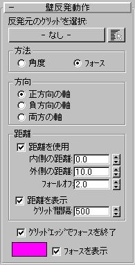 [フォールオフ](Falloff)[内側の距離](Inner Distance)と[外側の距離](Outer Distance)との間で反発力が減少するレートです。 既定値は 2.0 です。