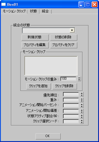 [状態](State)パネルのコントロールでは、非 Biped のモーション統合の状態を設定し、モーション クリップを状態にリンクします。