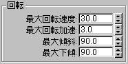 - 代理オブジェクトがフレームごとに回転できる最大の角度を指定します。ヘッディングおよびピッチの両方に適用されます。既定値は 30.0 です。