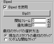 - Biped の最初のクリップが再生を開始するフレームを指定します。