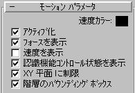 [モーション パラメータ](Motion Parameters)ロールアウトを使用すると、スピードや加速など、代理オブジェクトの特性を指定できます。また、代理オブジェクトを Biped に関連付けることもできます。