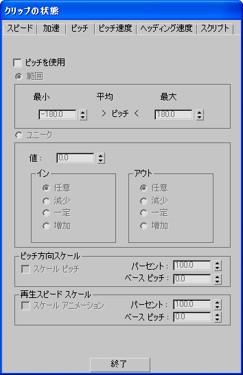 アニメーションが再生されるときのピッチを、代理オブジェクトのピッチに応じてスケールできます。既定値では[スケール ピッチ](Scale Pitch)はオフのとき、アニメートされたオブジェクトのピッチは通常どおりです。オンにすると、アニメーションを再生するときの[ベース ピッチ](Base Pitch)を設定できるほか、[ベース ピッチ](Base Pitch)が実際の代理オブジェクトのピッチによって修正される量(パーセント単位)を指定できます。[パーセント](Percentage)が 100 の場合、[ベース ピッチ](Base Pitch)だけが使用されます。それ以外の値では、ベース ピッチと代理オブジェクトのピッチの間でスケールされます。これは、鳥や他のオブジェクトは上昇するがピッチが上がらない場合に役立ちます。