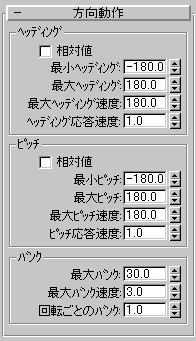 - このチェック ボックスにチェックマークが付いている場合、[ヘッディング](Heading)の設定値は動作が有効なときの代理オブジェクトの正面に相対的に適用されます。チェックマークが付いていない場合、設定値は絶対的に定まります。既定値ではチェックマークが付いていません。