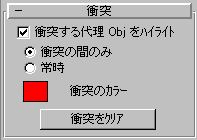 群集シミュレーション中に[衝突](Collisions)ロールアウトを使用すると、回避動作で定義された衝突に対してマークを付けることができます。代理オブジェクトの絶対半径が、その代理オブジェクトが回避するすべてのものの絶対半径と分割されるよう回避動作で定義されている場合、フレームで衝突が生じるとその旨が表示されます。衝突が多数発生すると、シミュレーションの結果が正しく再生されないことがあります。その場合は、シミュレーションのセットアップを変更すると改善されることがあります。