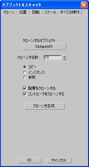 - このボタンをクリックすると、特定したクローンの数で[クローンするオブジェクト](Object To Clone)ボタンに表示されたオブジェクトのクローンが作成されます。