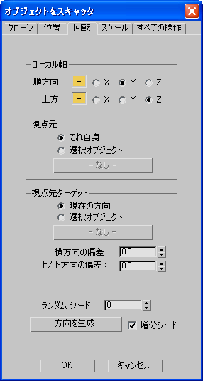 - このボタンを使用すると、「先」の方向を指定できます。ボタンをクリックして、スキャッタ オブジェクトが見る方向の先となるオブジェクトを選択します。