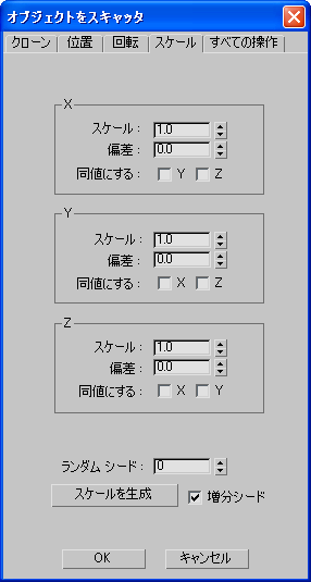 スキャッタ オブジェクトをスケールするオプションが含まれています。スケールの変化に対する軸ごとの偏差(オプション)を使用して、均等にスケールまたは不均等にスケールすることができます。