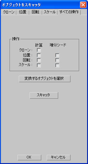 このボタンをクリックすると、すべてのスキャッタ オブジェクト、つまりクローンしたオブジェクトまたは[変換するオブジェクトを選択](Select Objects to Transform)ボタンで選択したオブジェクトをスケールできます。