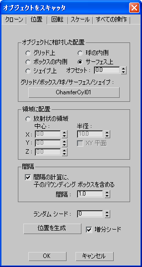 参照(配置)オブジェクトを使用してオブジェクトの位置を決定するオプションを含みます。グリッドや他のオブジェクトの表面上に、シェイプに沿って、または箱や球の内部にオブジェクトをランダムに配置できます。初めの 2 つのボックスからは 1 つのオプションしか選択できません。