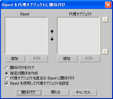このダイアログ ボックスを使用すると、任意の数の代理オブジェクトを同数の Biped に関連付けることができます。代理オブジェクトおよび Biped を 2 つのリストに追加し、お互いに適当なペアになるように並べます。その後、[指定の関係を作成](Make Specified Associations)を選択し、[関係付け](Associate)ボタンをクリックします。または、既存の代理オブジェクトと Biped の関係を削除するか、各代理オブジェクトとシーンで一番近い Biped を関連付けることもできます。