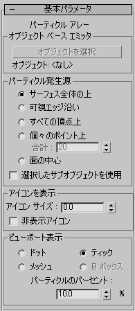 [基本パラメータ](Basic Parameters)ロールアウト上の項目を使用することで、パーティクル システムを作成し、そのサイズを調整し、分配オブジェクトを選択できます。更に、分配オブジェクトのジオメトリにパーティクルの初期分配を指定し、分配オブジェクトからパーティクルの初期速度を指定できます。ここから、ビューポート内にパーティクルを表示する方法を指定することもできます。