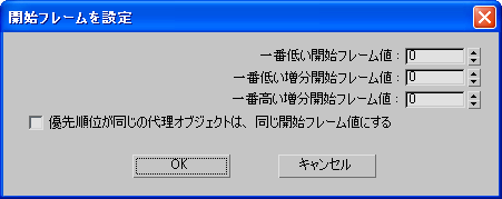 ダイアログ ボックスの設定と優先順位に基づいて、指定した代理オブジェクトに開始フレーム値を割り当て、ダイアログ ボックスを閉じます。