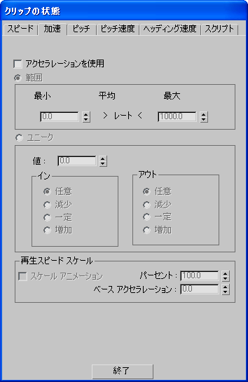 オンの場合は、代理オブジェクトの加速が特定の値に到達したときに、モーション統合エンジンがクリップをアクティブにします。特定の値の前後に値を増加させたり、減少させたり、一定にすることもできます。