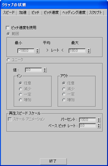 オンの場合は、代理オブジェクトのピッチ速度が指定した範囲内に到達したときに、モーション統合エンジンがクリップをアクティブにします。