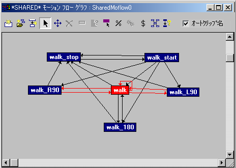 Biped のモーション フロー機能には、個別のモーションを相互に適合させて 1 つの滑らかなアニメーションにする方法を定義する仕組みがあります。実際には、モーション フロー ネットワークでは、どのモーションが他のモーションの後に続くかが表示されます。モーション フロー ネットワークが定義されると、ネットワークを通し別のパスに従うことで、広範囲にアニメートされた動作が可能になります。Biped では、ネットワークを介したパスはモーション フロー スクリプトと呼ばれます。