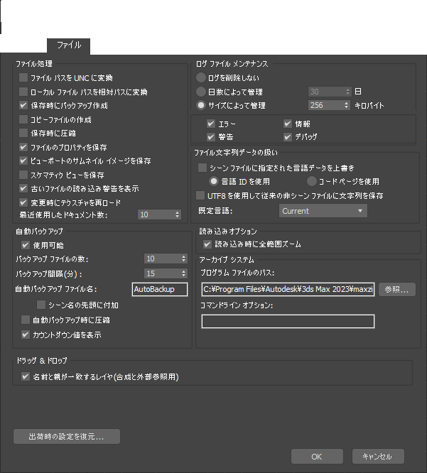 - 自動バックアップ ファイルに別名を入力できます。別名の自動バックアップ ファイルも拡張子は .max です。既定値は AutoBackup です。