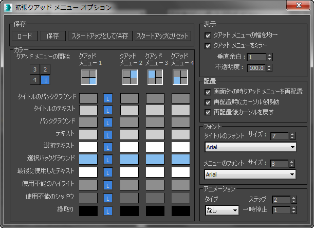 - クアッド メニュー オプション(.qop)ファイルをロードできます。