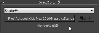 - [DirectX シェーダ]ロールアウトで、ドロップダウン リストから[ShaderFX]を選択し、[ShaderFX を開](Open ShaderFX)をクリックします。