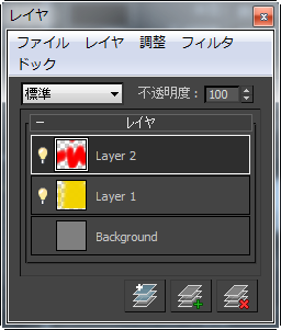 現在のテクスチャ内のレイヤがリストされ、それぞれのレイヤ名とサムネイル イメージが表示されます。レイヤの内容は、リストの一番下にあるレイヤ(バックグラウンド レイヤ)から始まって、リストされた順に上へと表示されていきます。つまり、各レイヤはリスト内で自身よりも下にあるレイヤにスーパーインポーズされていきます。