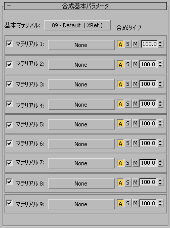 この 9 つのグループには、それぞれ合成するマテリアルのためのコントロールがあります。既定値では、マテリアルは割り当てられていません。