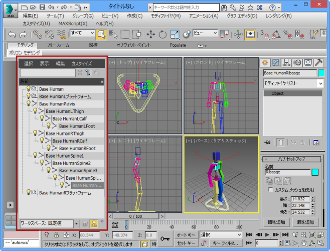 3ds Max インタフェースにドッキングされたワークスペース シーン エクスプローラ(赤のアウトライン)
