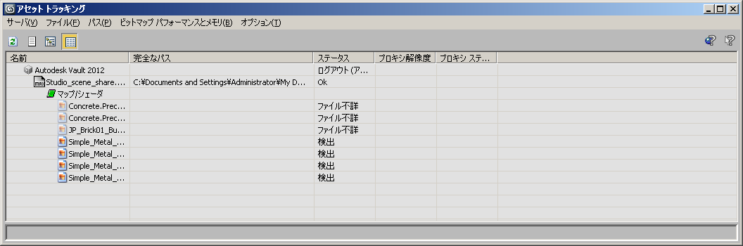ローカル ドライブにある現在のシーン アセットの一覧をアセットのフル パスおよびステータスと一緒に表形式で表示します。ブランチは階層構造になっていますが、展開したり集約したりすることはできません。