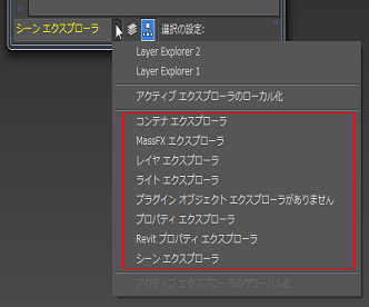 1. ローカル シーン エクスプローラでダイアログ ボックスの左下にあるテキスト フィールドの右にある矢印をクリックし、[アクティブ エクスプローラのグローバル化](Make Active Explorer Global)を選択します。