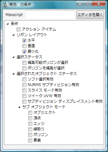 条件ダイアログ ボックスには、リボン要素のプリセットの条件を選択できるチェック ボックスのリストが表示されます。また、MAXScript を使用して、カスタマイズした条件を作成できます。