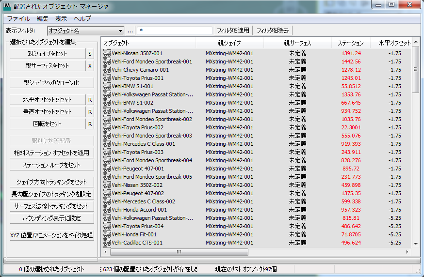 [配置されたオブジェクト マネージャ](Placed Object Manager)パネルでは、配置された複数のオブジェクトの位置パラメータをコントロールします。