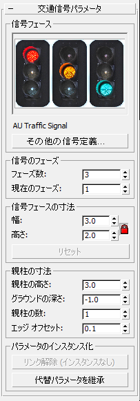 Civil View のパラメトリック交通信号では、単一標識フェース マップを使用し、これは複数の個別の水平セグメントに分かれます。 標識フェース ジオメトリのテクスチャ座標を変化させることにより、Civil View には常にこれらのセグメントの 1 つのみが表示されます。 これにより、ビットマップのセグメントを切り替え、信号が変化しているように見せることができます。 これらのパラメータはアニメートできます。