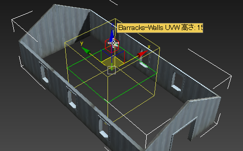 緑色のエッジが[UVW マップ](UVW Map)モディファイヤのギズモの側面に沿って表示されます。マウスでポイントするとエッジが赤に変わります。