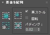 たとえば、複数のクラスタをグループ化した後、1 つのクラスタに属するポリゴンを選択して、[再スケール優先順位](Rescale Priority)を 0.5 に設定するものとします。その後、[再スケール](Rescale)オプションを有効にして、[組合わせでパック](Pack Together)または[平均化してパック](Pack Normalize)をすべてのクラスタに適用します。結果として、そのグループに属するクラスタは、[再スケール優先順位](Rescale Priority)を設定されていない場合のサイズの半分になります。(グループ化されていないクラスタは常にスケール係数 1.0 (100%)を使用します。)