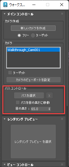 - ウォークスルー アシスタントを開きます。既定メニュー: [アニメーション](Animation)メニュー > [ウォークスルー アシスタント](Walkthrough Assistant) > [拡張コントロール](Advanced Controls)ロールアウト代替メニュー: [アニメーション](Animation)メニュー > [ツール (アニメーション セット)](Tools (Animation Set)) > [ウォークスルー アシスタント](Walkthrough Assistant) > [拡張コントロール](Advanced Controls)ロールアウト[パス コントロール](Path Control)領域で[パスを選択](Pick Path)をクリックし、作成したパスをクリックします。カメラが作成したパスにスナップします。