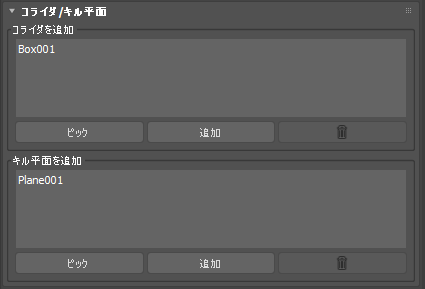 - [ピック](Pick)をクリックしてシーンからオブジェクトをピックしてキル平面として追加するか、[追加](Add)をクリックしてダイアログからキル平面を選択します。選択した既存のキル平面を削除するには、[削除](Delete)をクリックします。