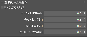 - [圧縮モデル](Compression Model)の方法の計算が泡シミュレーションにどのように適用されるかを制御します。この値を大きくすると、パーティクルが互いに反発する前に、より多くのパーティクルをオーバーラップすることができます。 一般的な泡シミュレーションでは、0 から 2 の間の値を使用します。