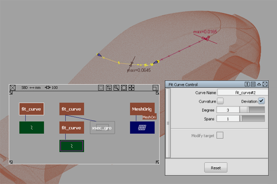 ツールを終了すると、フィットされたカーブのコンストラクション ヒストリがセクション データにリンクされます。Object Edit > Query Edit を選択した後、カーブを選択し、通常どおり Fit Curve ツールを再度起動できます。