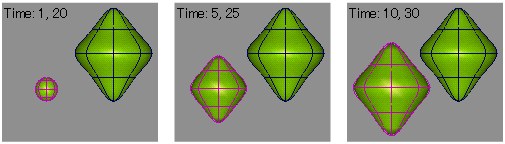 ジオメトリの元のシェイプを維持する場合は、この機能を起動する前に元のオブジェクトをコピーするか、オブジェクトの元のシェイプにキーフレーム タイムを設定しておきます。そうすれば、そのキーフレーム タイムを表示することにより、オブジェクトを元のシェイプに戻すことができます。