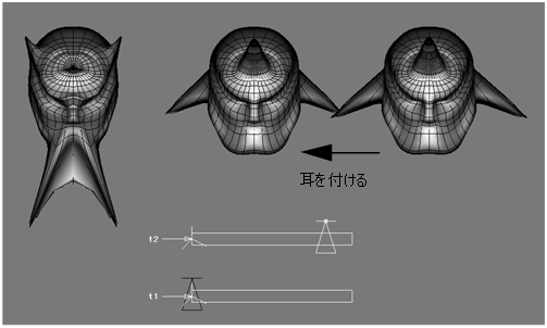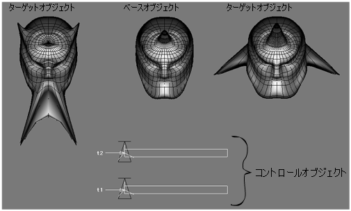 上のスライダのコントロール オブジェクトを動かすと、中央の頭に右の頭の特徴が取り込まれます。中央の頭も頭部が尖って左右の耳が生え始めていることに注意してください。このシェイプをシフトする度合いは、スライダで制御することができます。